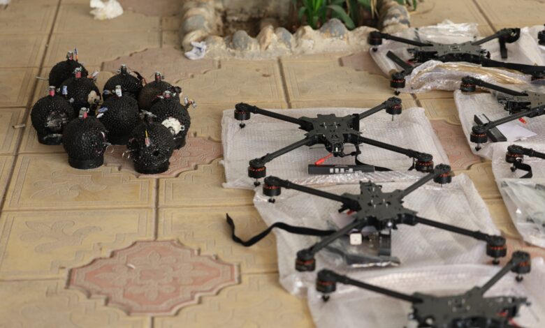 وأوضح الدالاتي أن العملية أسفرت عن ضبط طائرات مسيرة من نوع (FPV) مع كامل ملحقاتها، إضافة إلى أكياس من المواد المتفجرة من نوع TNT بوزن يقدر بنحو طن ونصف، وعبوات متفجرة مضادة للأفراد يزن كل منها نحو كيلوغرامين، كانت معدة للاستخدام ضمن طائرات انتحارية.