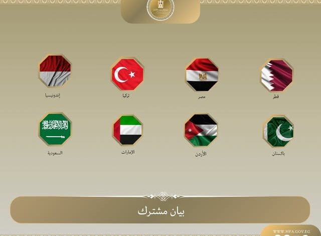 رحب وزراء خارجية جمهورية مصر العربية، والمملكة الأردنية الهاشمية، ودولة الإمارات العربية المتحدة، وجمهورية إندونيسيا، وجمهورية باكستان الإسلامية، وجمهورية تركيا، والمملكة العربية السعودية، ودولة قطر، اليوم بالخطوات التي اتخذتها حركة حماس حيال مقترح الرئيس الأمريكي دونالد ترامب لإنهاء الحرب على غزة، وإطلاق سراح جميع الرهائن، أحياء وأمواتا، والبدء الفوري بالمفاوضات للاتفاق على آليات التنفيذ.