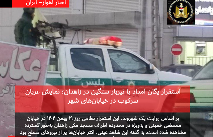 گزارش‌های میدانی و تصاویر منتشرشده از شهر زاهدان نشان می‌دهد که نیروهای یگان امداد پلیس، با استقرار خودروهای نظامی مجهز به تیربار سنگین روی وانت‌های هایلوکس، فضای امنیتی کم‌سابقه‌ای در سطح شهر ایجاد کرده‌اند؛ اقدامی که به‌گفته شهروندان، با هدف ارعاب معترضان و سرکوب هرگونه تجمع یا حتی شعار اعتراضی انجام شده است.