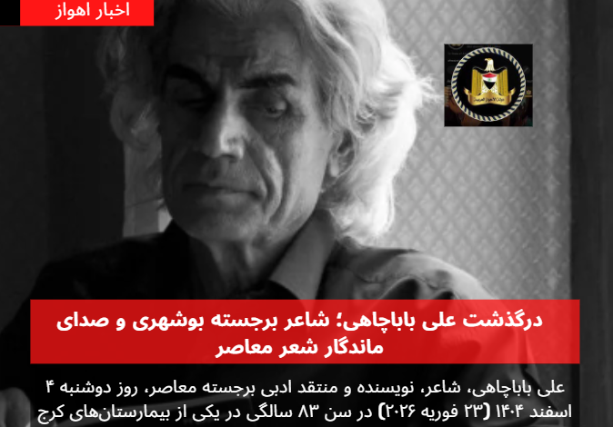 علی باباچاهی، شاعر، نویسنده و منتقد ادبی برجسته معاصر، روز دوشنبه ۴ اسفند ۱۴۰۴ (۲۳ فوریه ۲۰۲۶) در سن ۸۳ سالگی در یکی از بیمارستانهای کرج بر اثر ایست قلبی درگذشت. این شاعر نامآشنا که ریشه در جنوب ایران داشت، پس از یک دوره بیماری طولانی چشم از جهان فروبست.