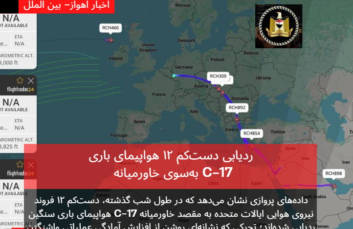 داده‌های پروازی نشان می‌دهد که در طول شب گذشته، دست‌کم ۱۲ فروند هواپیمای باری سنگین C-17 نیروی هوایی ایالات متحده به مقصد خاورمیانه ردیابی شده‌اند؛ تحرکی که نشانه‌ای روشن از افزایش آمادگی عملیاتی واشنگتن در بحبوحه تشدید تنش‌های منطقه‌ای است.