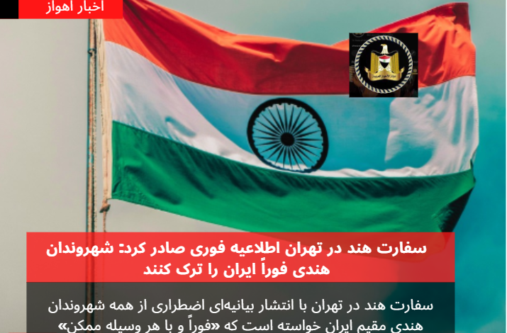 سفارت هند در تهران با انتشار بیانیه‌ای اضطراری از همه شهروندان هندی مقیم ایران خواسته است که «فوراً و با هر وسیله ممکن» جغرافیای ایران را ترک کنند.