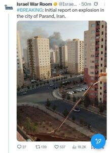 در یکی از تصاویر منتشرشده که توسط حسابی با عنوان «اتاق جنگ اسرائیل» در شبکه اجتماعی ایکس بازنشر شده، نمایی از مجتمعهای بلند مسکونی پرند دیده میشود که در پسزمینه آن تودهای از دود تیره و فشرده به آسمان صعود میکند؛ زاویه عکس از داخل یک واحد مسکونی یا بالکن گرفته شده و خیابانها و خودروهای پارکشده در پایین تصویر نشان میدهد حادثه در محدودهای شهری و پرجمعیت رخ داده است. انتشار این تصویر توسط یک منبع خارجی باعث شده ابعاد رسانهای ماجرا فراتر از سطح محلی برود و موجی از واکنشها و گمانهزنیها در فضای مجازی شکل بگیرد.