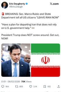 در اقدامی کمسابقه و صریح، مارکو روبیو، وزیر امور خارجه ایالات متحده بههمراه وزارت خارجه این کشور، از تمام شهروندان آمریکایی خواستند که فوراً جغرافیای ایران را ترک کنند؛ هشداری که نشاندهنده ورود تنشها به مرحلهای تازه و پرخطر است.
