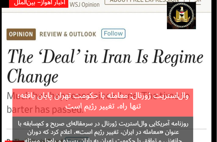 روزنامه آمریکایی والاستریت ژورنال در سرمقالهای صریح و کمسابقه با عنوان «معامله در ایران، تغییر رژیم است»، اعلام کرد که دوران چانهزنی و توافق با حکومت تهران به پایان رسیده و راهحل مسئله حکومت تهران، نه در توافقهای دیپلماتیک، بلکه در تغییر بنیادین ساختار قدرت نهفته است.
