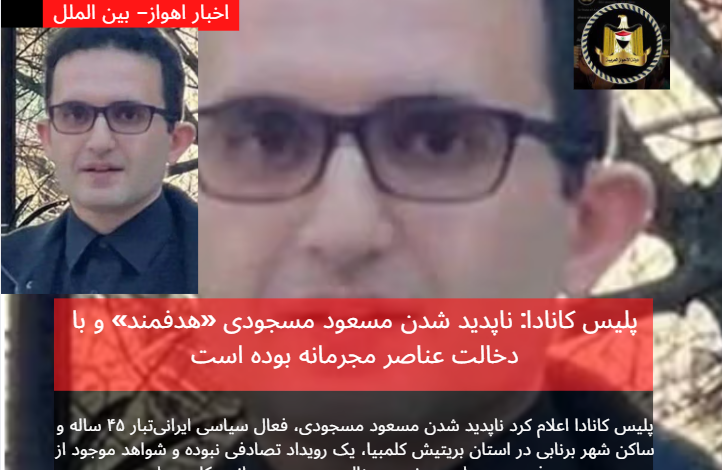 پلیس کانادا اعلام کرد ناپدید شدن مسعود مسجودی، فعال سیاسی ایرانیتبار ۴۵ ساله و ساکن شهر برنابی در استان بریتیش کلمبیا، یک رویداد تصادفی نبوده و شواهد موجود از هدفمند بودن این پرونده و دخالت عنصر مجرمانه حکایت دارد.