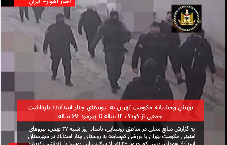 یه گزارش منابع محلی در مناطق روستایی، بامداد روز شنبه ۲۷ بهمن، نیروهای امنیتی حکومت تهران با یورشی کمسابقه به روستای چنار اسدآباد در شهرستان اسدآباد همدان، دستکم حدود ۴۰۰ نفر از ساکنان این روستا را بازداشت کردند؛ عملیاتی که از ساعات اولیه صبح آغاز شد و تا ساعاتی بعد ادامه یافت.